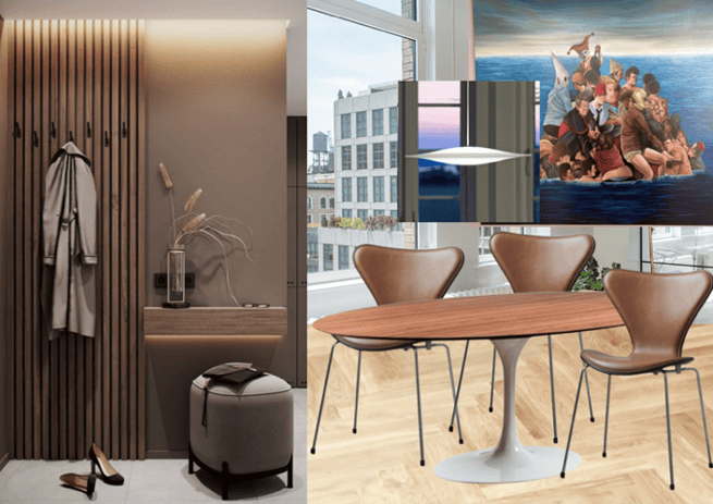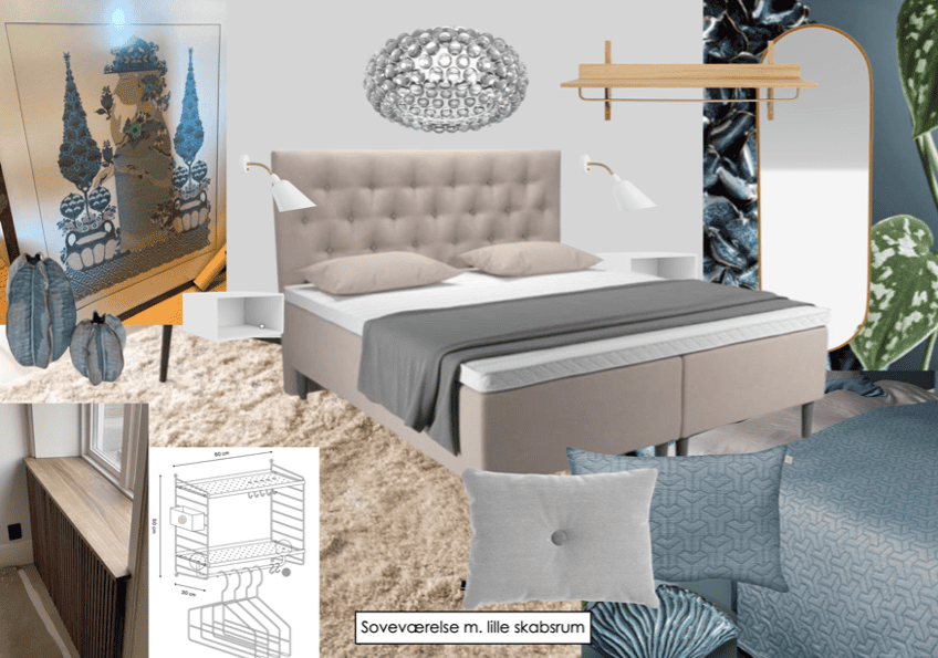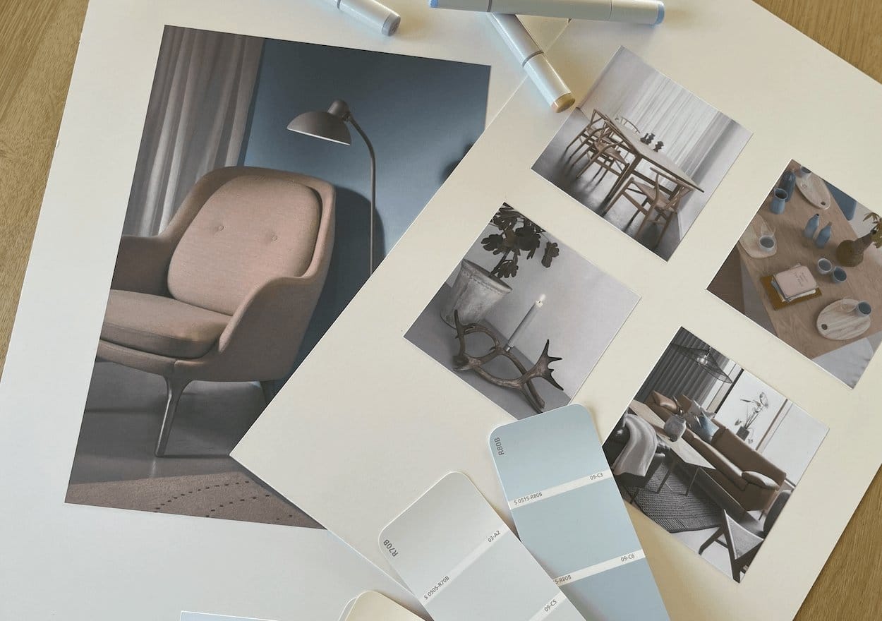 På baggrund af første besøg med gennemgang af dit budget og dine ønsker til din nye indretning, laver jeg et moodboard, som er en visuel præsentation af farver og interiør, der sammensat med det du har i forvejen, vil optimere din indretning.